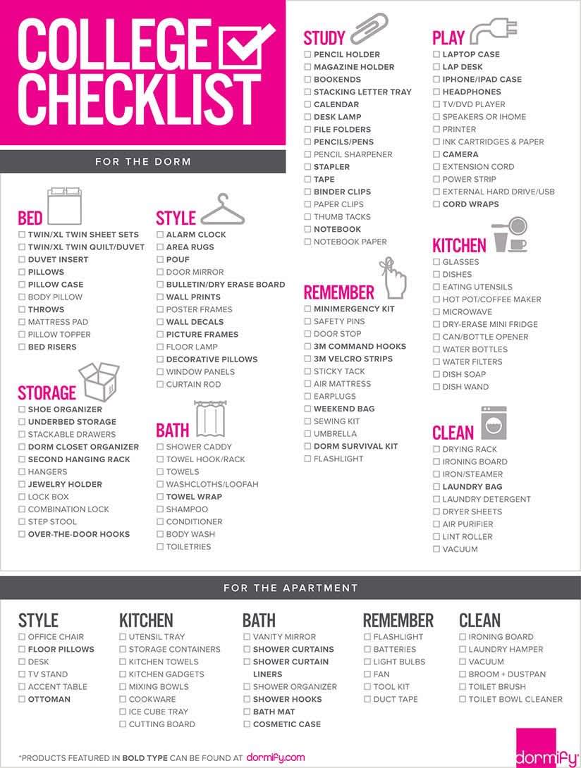 This is NOT a school supply list! Take these lists into your own personal considerations while navigating around the internet for dorm checklists. Use them as an OUTLINE! if you end up buying every single thing on this list, chances are most items will be unused under the bed or thrown away at the end of the year! It is a waste of money to check everything off this list! Assess how you live now and what items are pertinent in your daily life; therefore, you can know what exactly you need to buy, before purchasing the entire store of Bed Bath & Beyond.