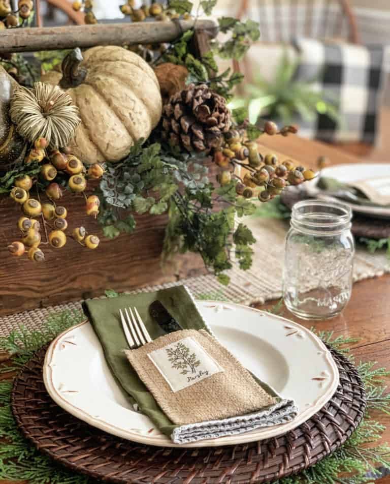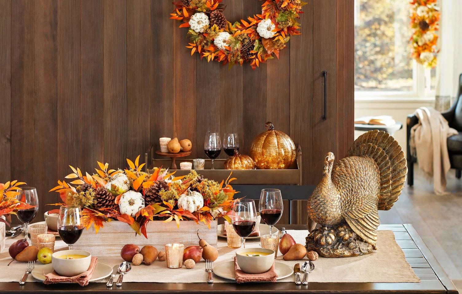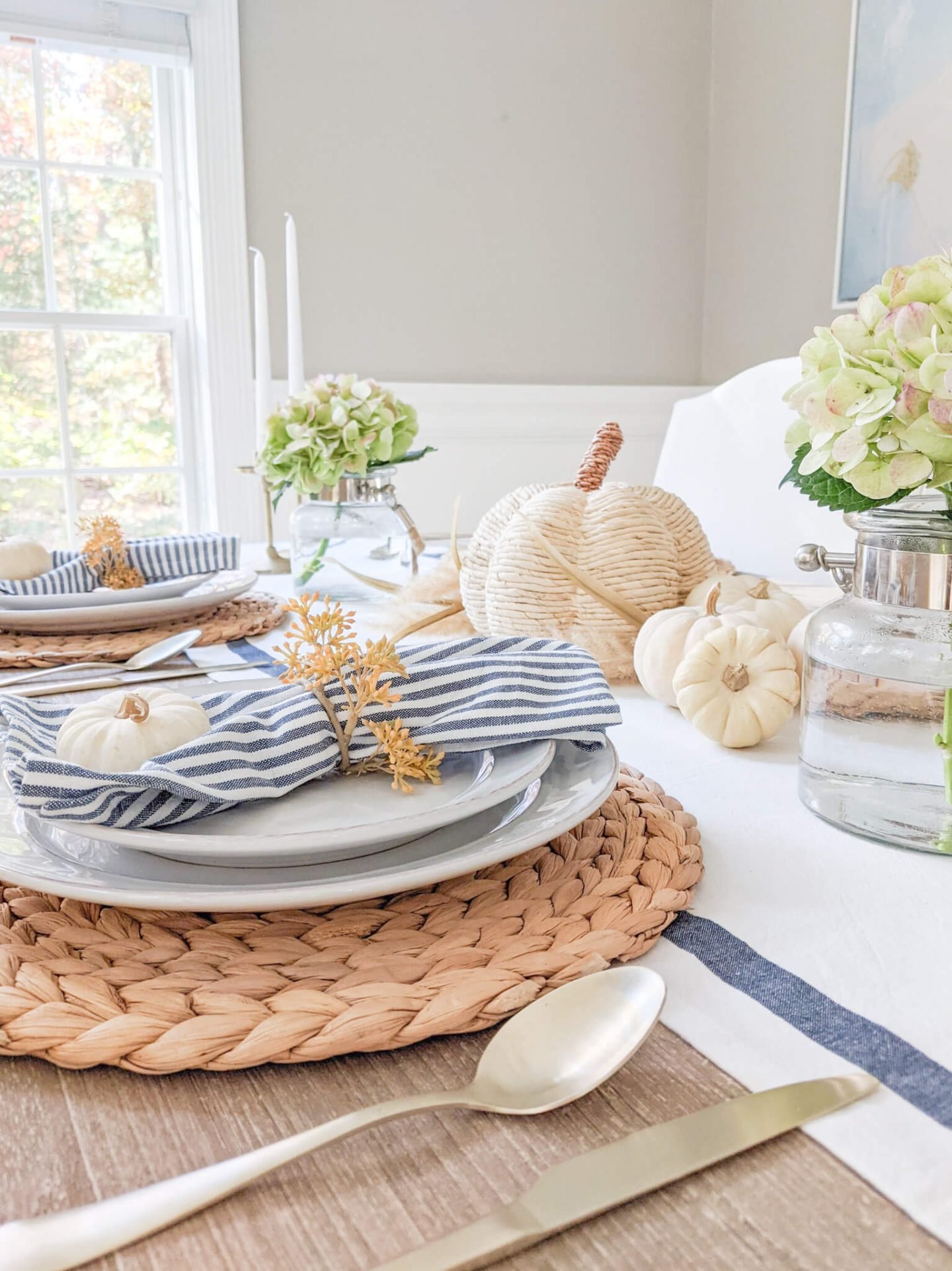 Think light, breezy, and totally chic. Start with a soft linen runner in ivory or sand tones. Layer rattan or driftwood chargers and neutral plates. Add white pumpkins, shells, and subtle gold accents. Finish with crystal stemware and candles for a cozy glow. This look is perfect for beachy Florida homes that want elegance with a relaxed vibe.
