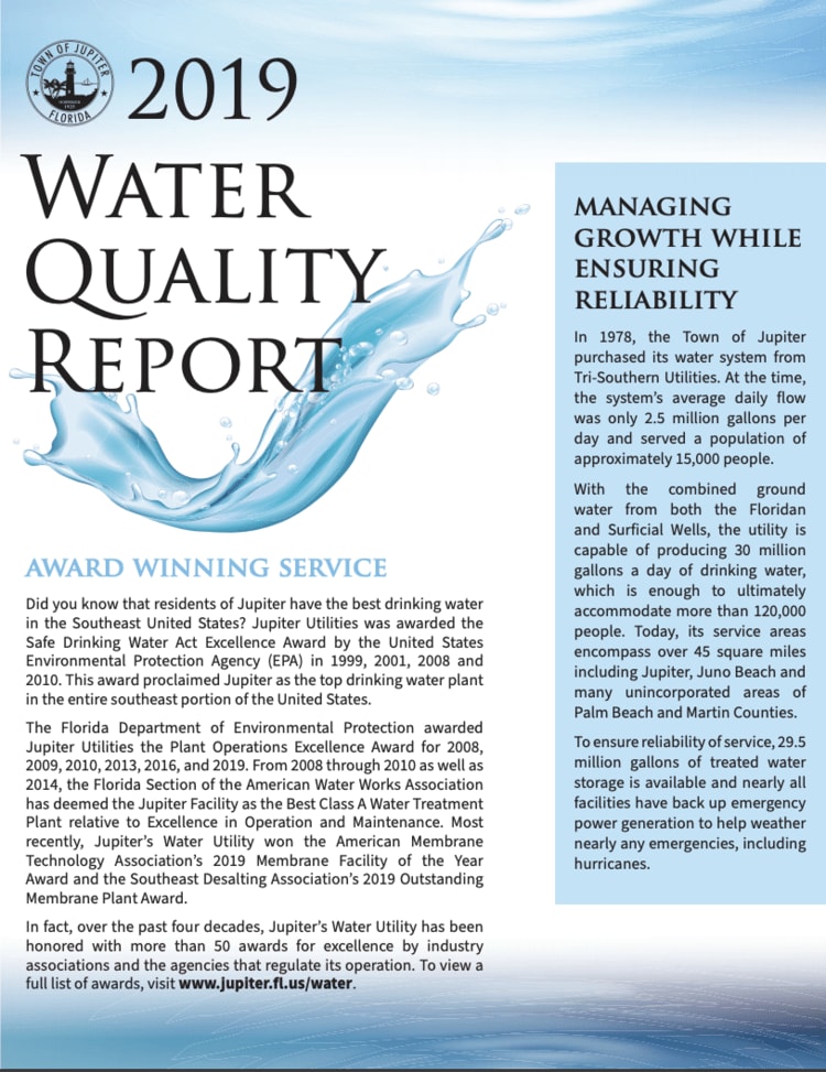 Did you know that residents of Jupiter have the best drinking water in the southeast United States? Jupiter Utilities has received many awards for water treatment excellence. In fact, over the past two decades, Jupiter’s water utility has been honored by more than 50 awards for excellence in operations, treatment and drinking water.